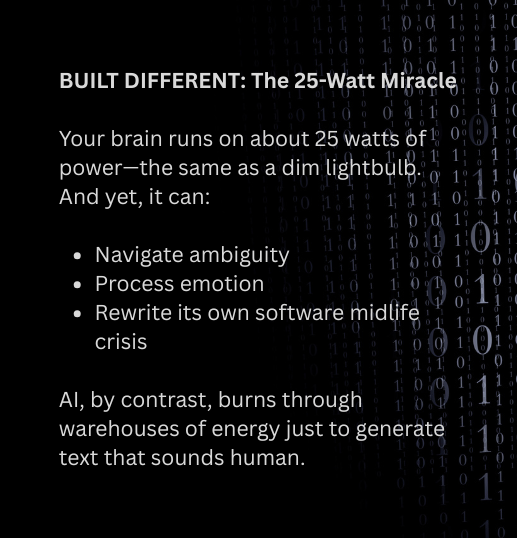 Your brain is a 25-watt biochemical miracle with 86 billion neurons making over 100 trillion connections. It filters out noise, integrates sensory inputs, adapts in real time, and runs on coffee and chaos. It’s not just powerful—it’s alive.